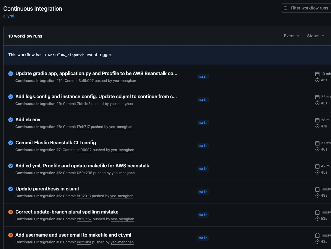 I will be combining 2 tutorials to utilise both Github Actions and AWS Beanstalk. The original tutorial on using github actions pushes the code to huggingface instead of AWS but I believe there will be more value in learning AWS, especially in debugging configurations compared to the more hassle free deployment of gradio apps to hugging face.